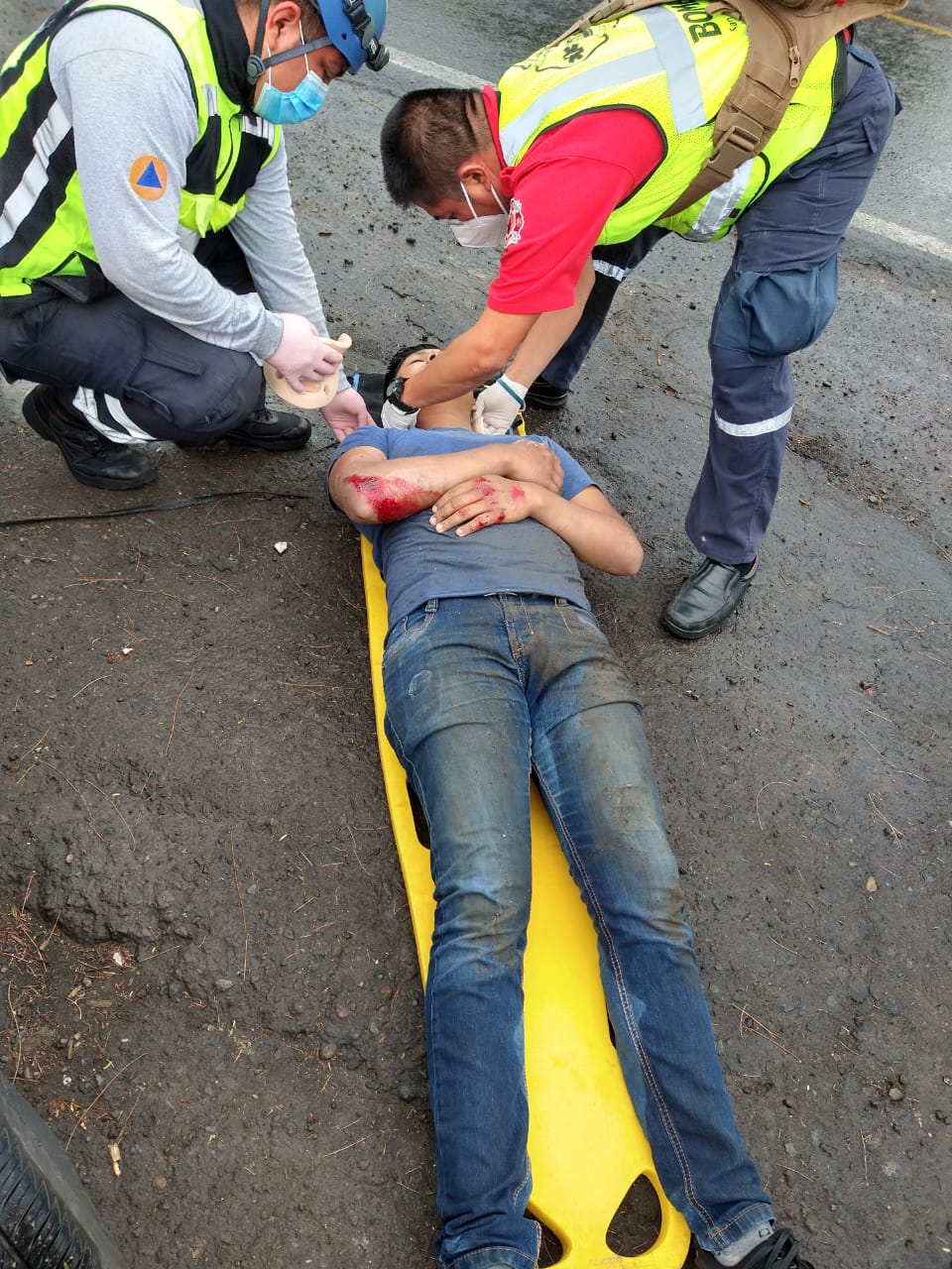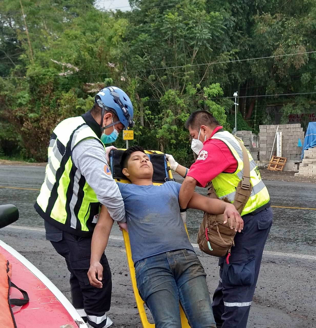 En el lugar los paramédicos encontraron a un masculino lesionado, el cual presentaba laceraciones y golpes en diferentes partes del cuerpo, por lo que una vez que recibió los primeros auxilios fue trasladado al hospital Bernardo Peña, quien dijo llamarse Jesús Fiscal Tome de 18 años, mismo que conducía una motocicleta en compañía de otra persona que resultó ileso.