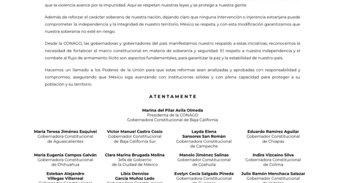 Por ello se sumó al pronunciamiento de la Conferencia Nacional de Gobernadoras y Gobernadores (CONAGO), que enfatizó la importancia de consolidar el marco constitucional en materia de seguridad y soberanía, destacando que estas reformas contribuirán a fortalecer la independencia del Estado mexicano y garantizar la paz y estabilidad del país.