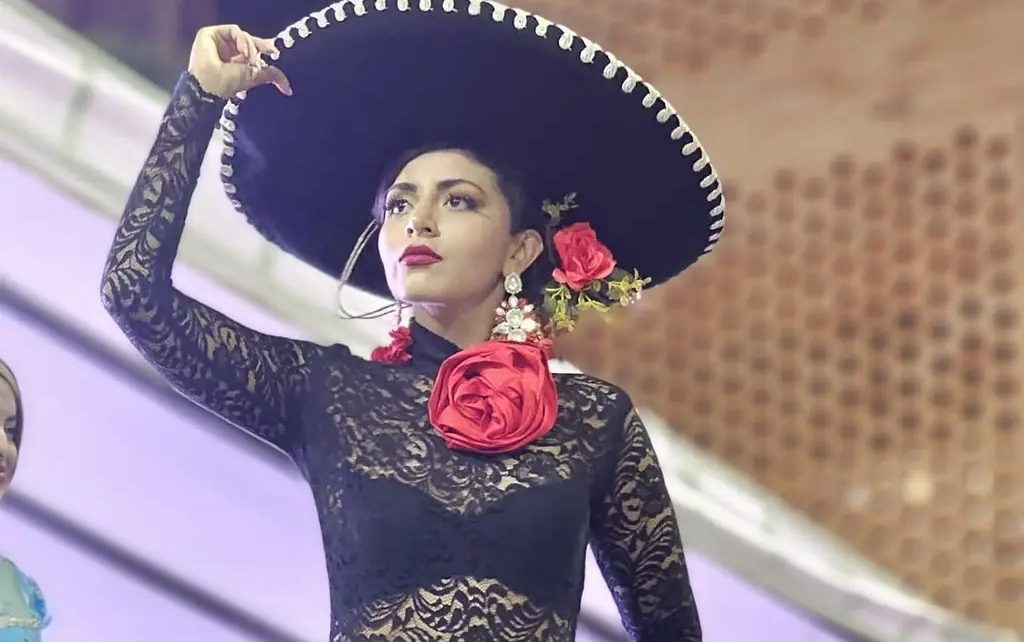 El traje típico estilizado “Mexicana de Corazón/Amor a la Mexicana” está confeccionado en encaje italiano con rosas rojas en relieve en tefetán rojo y como accesorio principal el Sombrero de Charro, perteneciente a la longeva colección del Ballet Tradiciones de México.